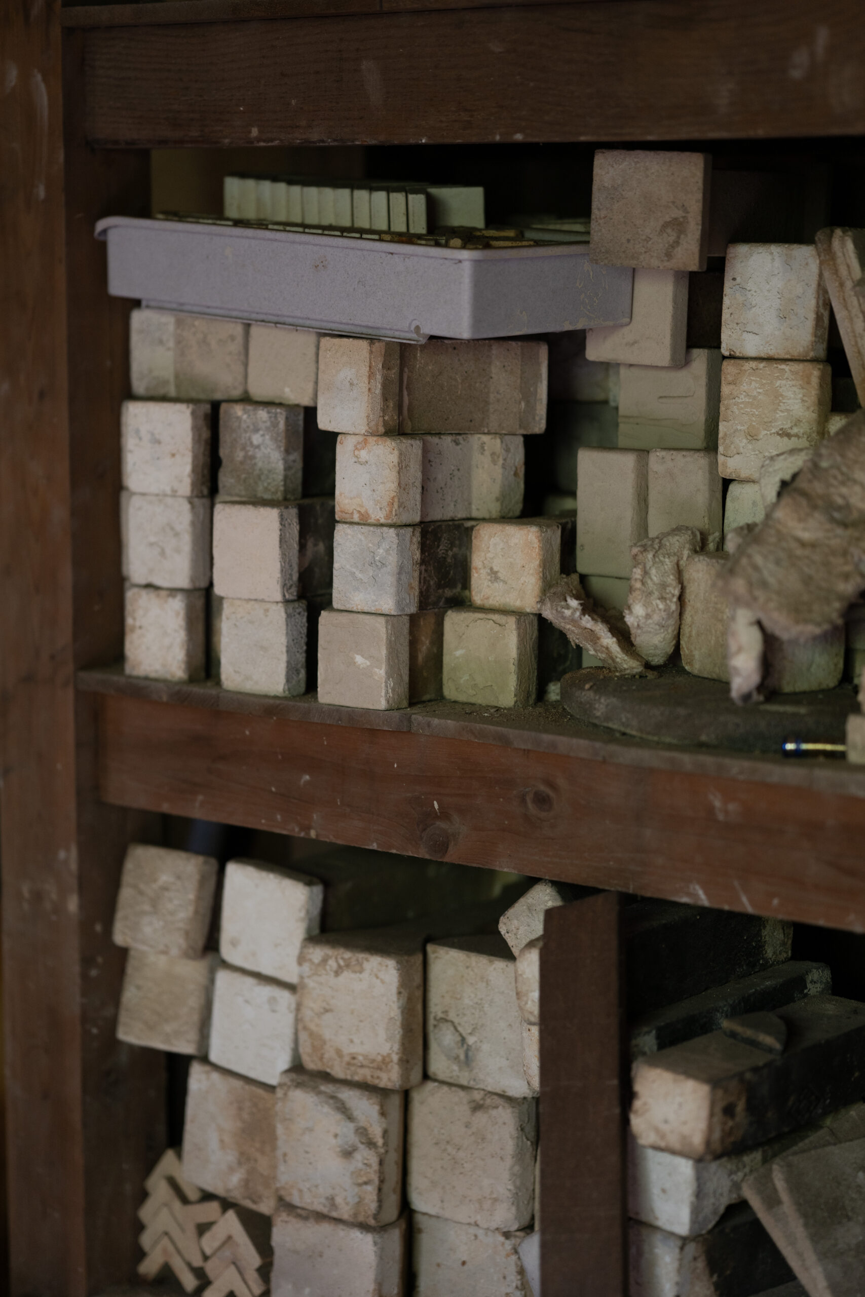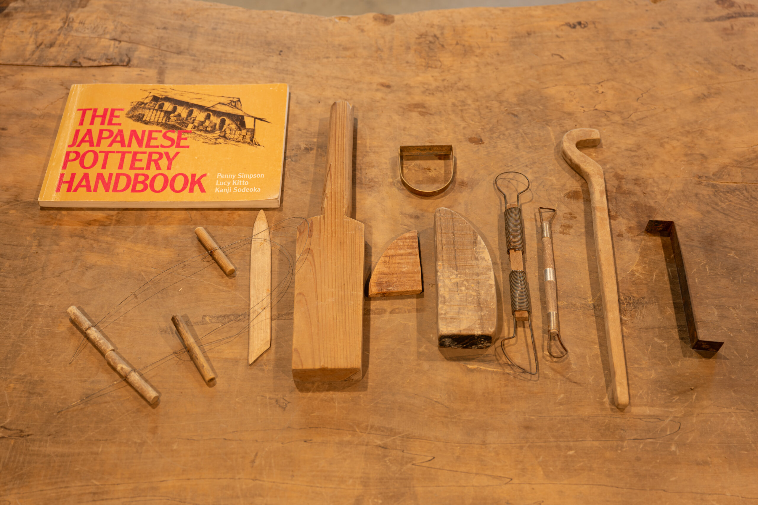 【設備】 ろくろ3台、土練機、土練り台を備える。基本的な道具は写真参照のこと。